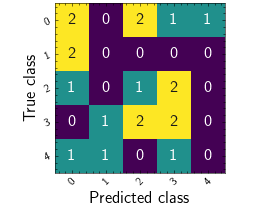 The confusion matrix \(C\) is constructed such that \(C_{i, j}\) is equal to the number of observations known to be in class \(i\) but predicted to be in class \(j\). Thus row indices of the confusion matrix correspond to the true class labels and column indices correspond to the predicted class labels.